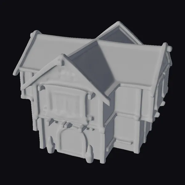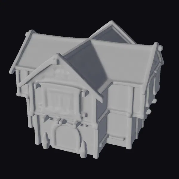 Gaze upon the intricate details of this medieval village tavern, where a steeply pitched roof and cream-colored walls with brown trim transport you to a quaint village setting. The wooden accents, including a balcony and door, add a touch of rustic charm. Two lanterns flank the door, while a stone foundation and wooden barrels at the base of the building add depth. This highly stylized model, rendered in a chibi art style, boasts deeply carved details that make it perfect for use in games, 3D printing, VR/AR experiences, animation, and architectural design.