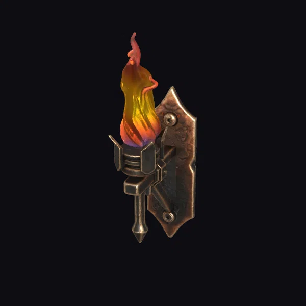 Positioned dynamically on a rugged iron bracket, the torch’s flame dances with a mesmerizing blend of orange, yellow, and red hues, as if casting a warm glow on the surrounding environment. The bracket itself boasts an intricate design, complete with a sturdy backplate and a pointed finial, exuding a sense of rugged elegance. As a 3D model, this medieval wall torch is perfect for adding a touch of authenticity to games, animations, or architectural visualizations. Its realistic style and detailed textures make it an excellent choice for designers and artists seeking to create immersive environments.