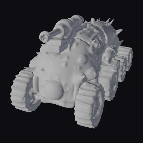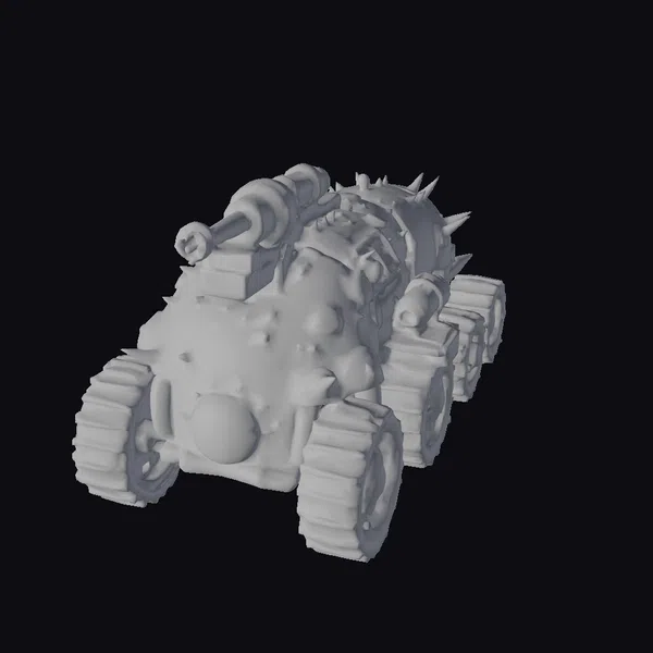 Detailed with precision, this armored vehicle showcases a weathered, green exterior with significant rust and wear, indicating extensive use in battle. The vehicle’s body is reinforced with metal plates and studded with sharp spikes for added defense. A prominent cannon on top, accompanied by a smaller one on the side, signifies its formidable firepower. The thick, rugged treads on its wheels are designed for navigating challenging landscapes. Ideal for use in games, 3D printing, VR/AR experiences, animation, and design projects, this model brings a touch of medieval warfare to any project.