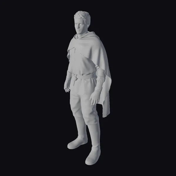 Detailed with precision, the young man’s attire consists of a sturdy brown leather tunic, complemented by dark green pants and a flowing cape draped over his shoulder. His outfit is completed with knee-high brown boots and a wide leather belt around his waist. A silver emblem adorns his left arm, adding a touch of elegance to his overall medieval look. This 3D model is perfect for projects requiring a heroic or historical figure, such as animations, games, or architectural visualizations. Its realistic style ensures it will blend seamlessly into any scene, drawing viewers into the narrative.