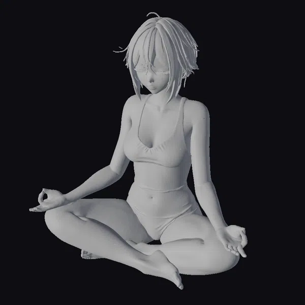 This stunning 3D model captures a woman in a meditative pose, exuding calmness and serenity. Her white hair is styled in a short, choppy fashion, framing her face with soft strands. Her eyes are closed, and her hands are placed gently on her knees, with fingers curled in a peaceful gesture. She wears a simple gray two-piece outfit that complements her tranquil demeanor. The model’s smooth skin and subtle shine enhance her lifelike appearance. The pose is dynamic yet calming, making it perfect for projects requiring a serene character. Ideal for use in animations, games, VR/AR experiences, and designs focused on wellness and relaxation.
