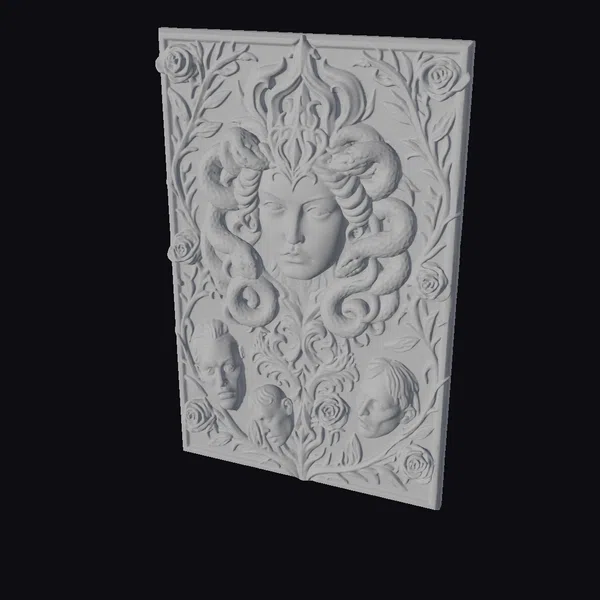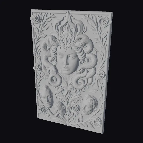 Crafted with meticulous attention to detail, Medusa’s visage emerges from a tangle of serpents, their scales glistening with a subtle sheen. The central figure’s face, rendered in smooth, alabaster-like stone, seems almost serene, contrasting with the frenzied movement of the snakes. Three severed heads, each with a distinct expression of horror or despair, are positioned at the base, adding a layer of narrative depth. The entire scene is framed by a delicate border of roses and foliage, intricately carved to create a sense of texture and depth. This 3D model would be perfect for projects requiring a touch of mythological drama, from game environments and animations to architectural designs and artistic sculptures. Its unique blend of the macabre and the beautiful ensures it will captivate audiences and inspire imagination.