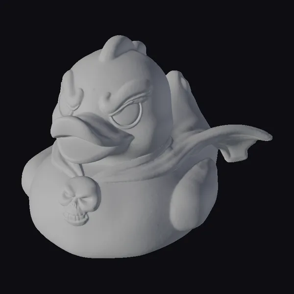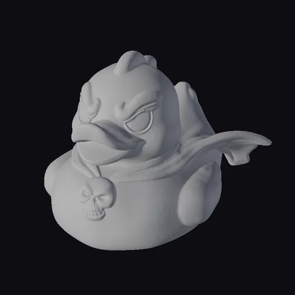 This menacing rubber duck stands out with its intensely scowling face, a stark contrast to the cheerful image of a typical rubber duck. The bright yellow rubber surface is now twisted into a menacing expression, complete with sharp, tiny fangs and an open, orange beak. A black cape flows dynamically behind it, adding a sense of movement and drama. Around its neck, a silver skull pendant hangs, adding an edgy touch. The combination of these elements – the scowl, cape, fangs, and skull pendant – transforms this rubber duck into a unique collectible or decorative piece. Its detailed design makes it suitable for various applications, including game development, animation projects, or as a distinctive prop in design and collectibles.