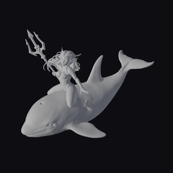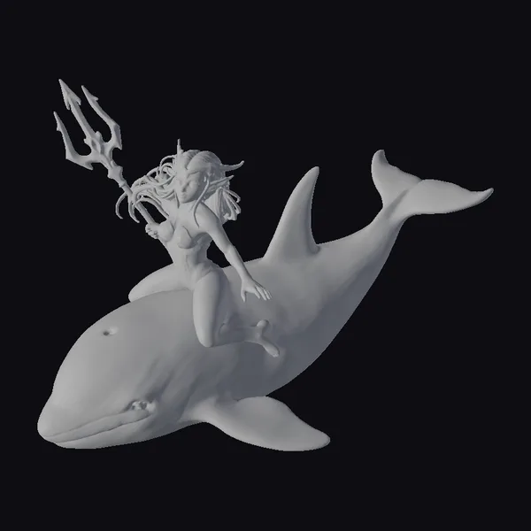 Positioned dynamically, the mermaid sits atop the orca, her long hair flowing behind her like seaweed in the current. The orca’s body is rendered in exquisite detail, with a striking black and white pattern that seems to shimmer in the light. The mermaid’s tail glistens with a subtle sheen, while her trident appears powerful and menacing. This model is perfect for use in games, animation, or 3D printing, offering a unique and eye-catching addition to any underwater scene. Designers and artists will appreciate the level of detail and realism achieved in this model.
