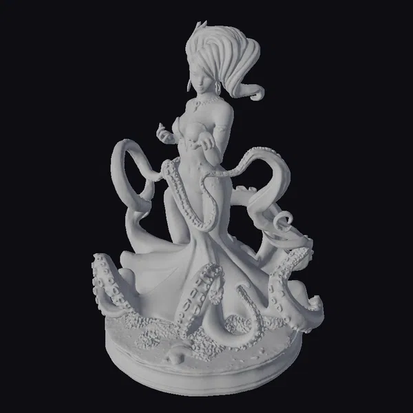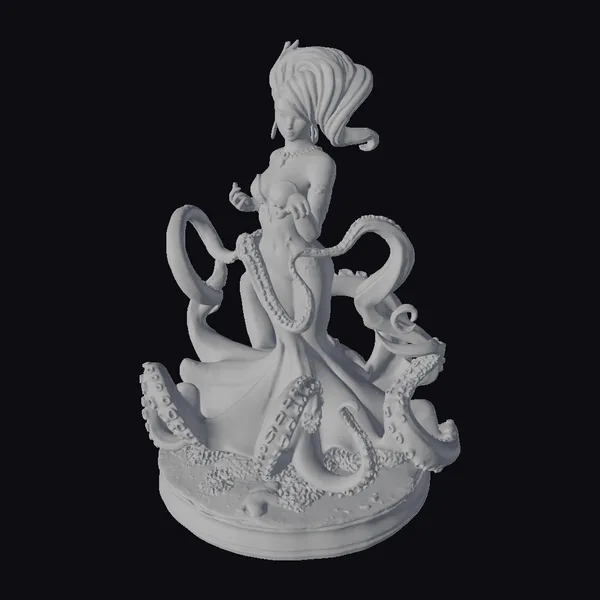 Perched on a vibrant red base, this captivating sculpture showcases a mermaid with an ethereal beauty. Her flowing silver hair dances in the breeze, while her tail shimmers with a pearlescent sheen. The dark blue and purple tentacles that envelop her appear almost lifelike, complete with suckers and texture that invites the eye to linger. The base, adorned with coral and sand, adds a touch of realism to this fantastical scene. This model is perfect for artists, animators, and fantasy enthusiasts looking to bring a touch of oceanic magic to their projects, whether in games, animation, print, or VR/AR experiences.