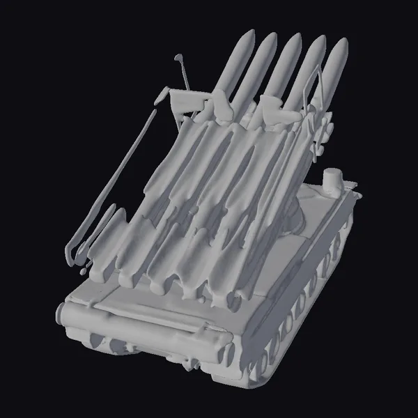 Crafted with meticulous attention to detail, this realistic model showcases a missile launcher tank with a rugged, industrial design. The metallic grey surface reflects light, accentuating the complex mechanisms and textures of the machinery. Positioned dynamically, the launcher’s tubes are angled upwards, suggesting imminent action. This model is perfect for projects requiring a blend of military and industrial themes, such as game environments, animations, or architectural designs. Its high level of detail makes it suitable for close-up shots or scenes where machinery plays a critical role.