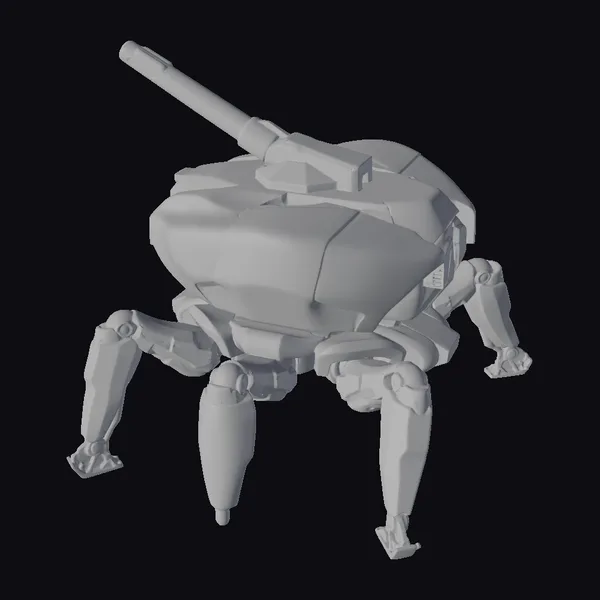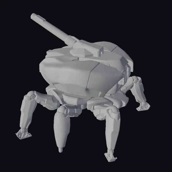Perched on six articulated legs, this mechanical monstrosity combines the agility of a spider with the brute force of a tank. The body, a complex assembly of metallic plates, showcases a rugged, industrial aesthetic. A long gun protrudes from the top, angled menacingly upwards. Gold accents on the joints suggest a level of sophistication and advanced engineering. The model’s surface texture, with visible bolts and plates, adds to its realistic, high-tech appearance. Ideal for use in sci-fi games, animations, or designs requiring a futuristic, militarized robot. The model’s pose, with legs splayed wide, conveys a sense of readiness and mobility.