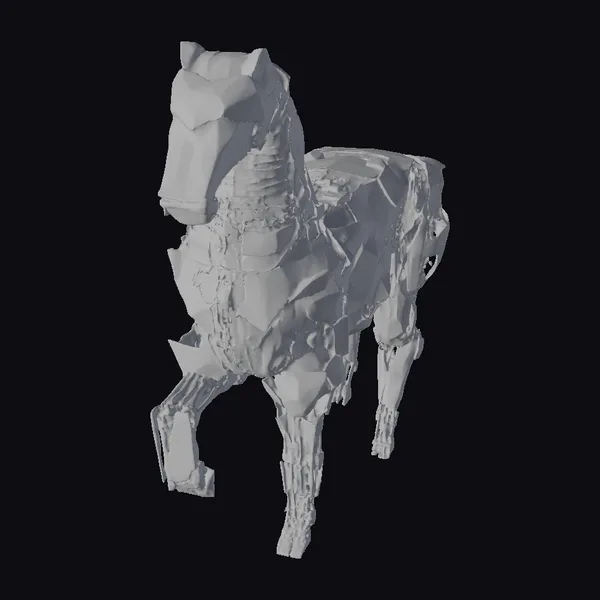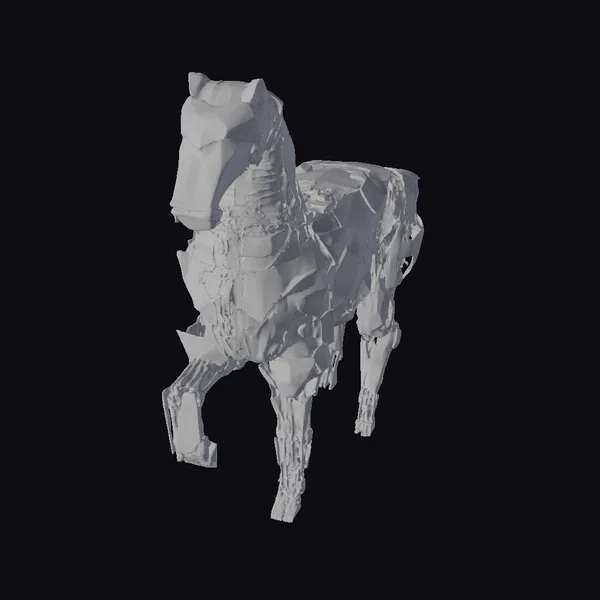 In a pose that suggests dynamic movement, this metallic horse sculpture is crafted from numerous polygonal pieces that fit together to form a cohesive, robotic equine figure. The surface texture is a mix of smooth, reflective metal and sharper, jagged edges, giving the piece a complex, high-tech appearance. Light reflects off its body, highlighting the intricate details and geometric shapes that make up its form. The sculpture’s design could inspire a variety of applications, from concept art in games and animation to 3D printing and architectural design. Its futuristic aesthetic makes it a compelling addition to any project aiming for a sci-fi or cyberpunk vibe.