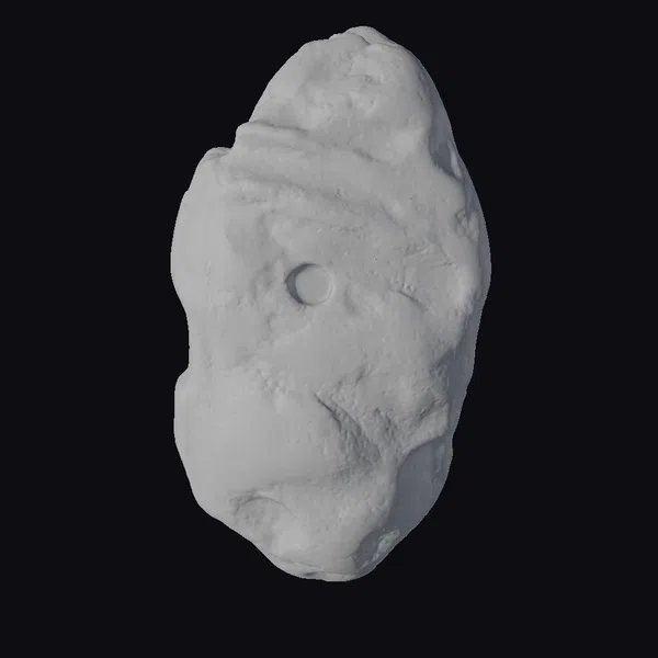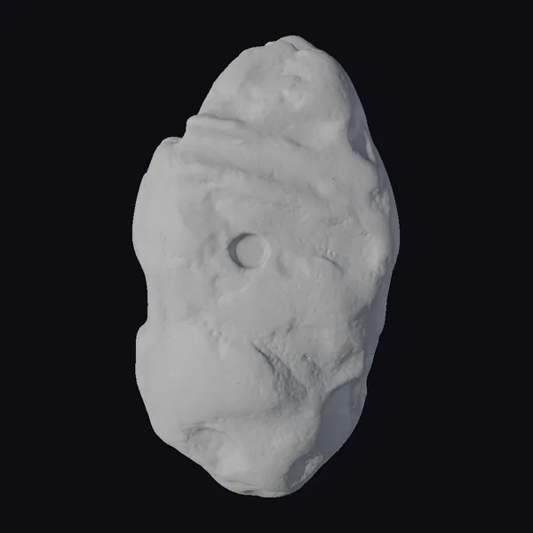 This meteorite fragment 3D model showcases a detailed, realistic representation of a natural, extraterrestrial object. The model’s surface is characterized by a predominantly yellow and brown color scheme, with a mix of smooth and rough textures that give it an authentic, organic appearance. A distinctive circular indentation on its surface adds a unique feature to this already fascinating piece. The model’s proportions and shape are accurately captured, making it suitable for various applications such as scientific visualizations, educational materials, or even decorative pieces. Its realistic style ensures that it can be seamlessly integrated into projects requiring a high level of detail and accuracy.