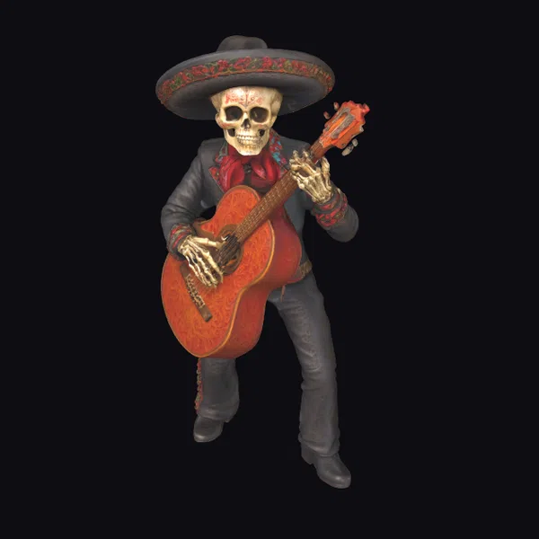In a dynamic pose, this skeleton musician is captured mid-strum, its bony fingers pressing into the strings of a bright orange guitar. The skeleton’s skull is intricately detailed, with visible teeth and eye sockets, set against a backdrop of a stylized, traditional Mexican outfit. The black charro suit, complete with red and green embroidery, is complemented by a large, ornate sombrero and a red bow tie. The guitar, with its unique orange and red pattern, seems to glow with an inner light. This model is perfect for projects requiring a touch of whimsy and cultural flair, such as animations, games, or designs for Dia de los Muertos celebrations. Its stylized yet detailed appearance makes it a versatile asset for various creative ventures.