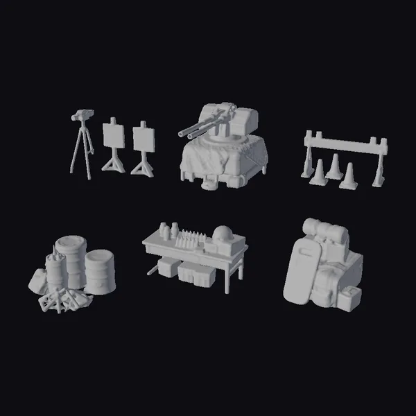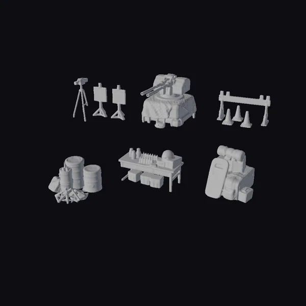 In a scene that could be straight out of a tactical briefing, this military equipment collection presents a variety of assets essential for any high-stakes operation. At the center, a camouflaged gun emplacement stands ready, complete with a mounted machine gun and binoculars on a tripod for reconnaissance. To the side, a rack of traffic cones and barriers suggests a secured perimeter. Workbenches are strewn with an assortment of weapons, helmets, and tactical gear, highlighting the meticulous preparation that goes into military operations. Barrels and crates, some marked with yellow indicators, add to the authenticity of the scene, suggesting fuel, ammunition, or supplies. The models are rendered in a realistic style, with attention to texture and color that brings a sense of grit and realism. The muted green and tan color scheme helps these pieces blend into a variety of environments, from desert to forest. These 3D models are perfect for inclusion in games, simulations, virtual reality experiences, animations, or any project requiring detailed military equipment.