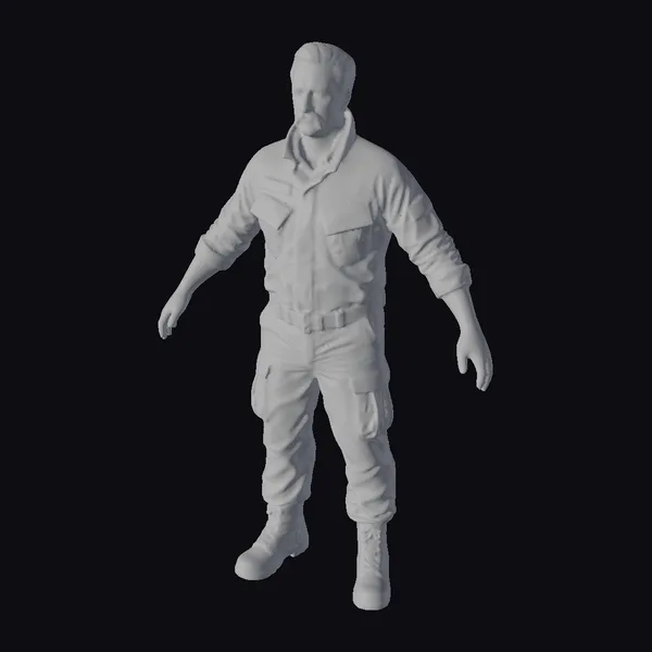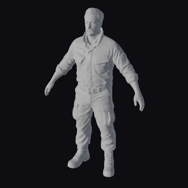 Detailed with precision, this 3D model of a military man showcases a realistic portrayal of a soldier in a camouflage uniform. The pose, with arms slightly extended, suggests a moment of pause during a mission. The uniform is meticulously textured, with visible wear and tear that adds to the realism. The facial features are stern, contributing to the overall mood of determination and vigilance. This model is perfect for projects that require a realistic military presence, such as video games, animations, or simulations. Its high level of detail, from the camouflage pattern to the laces on his boots, ensures it will integrate seamlessly into a variety of environments.