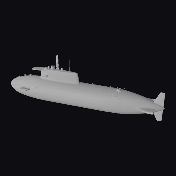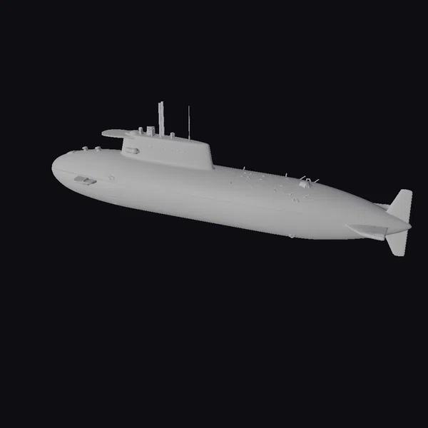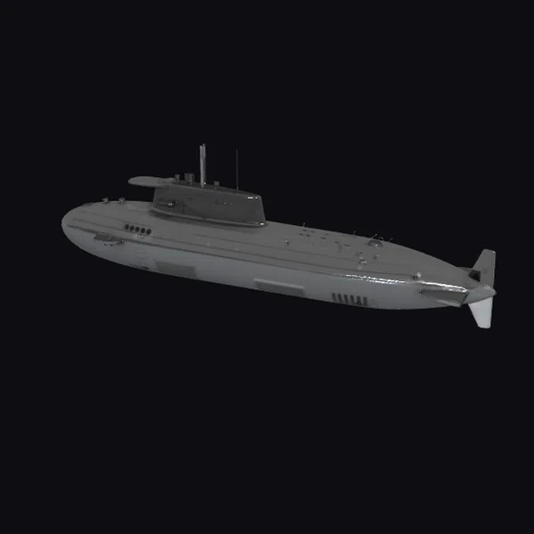 Positioned dynamically, the submarine showcases its streamlined body, essential for navigating the underwater realm with ease. The conning tower and antennas on top suggest advanced communication and surveillance capabilities. The hull, with its array of hatches and panels, hints at the complex technology and machinery within. This model is perfect for projects requiring a realistic and detailed representation of a military submarine, suitable for use in simulations, games, animations, and architectural designs that require naval vessels.