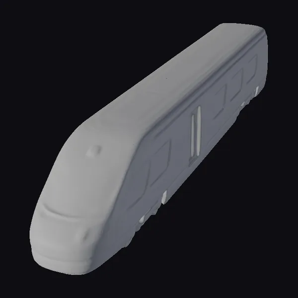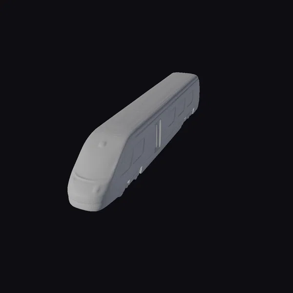 Positioned at a dynamic angle, the train carriage showcases its aerodynamic front, complete with a dark grey windshield and a bold orange and white color scheme. The side of the carriage features multiple windows, adding to its sense of movement and functionality. A red light strip runs along the top, giving the model a touch of high-tech flair. The grey roof and blue undercarriage complete the model’s sleek appearance. This stylized model is perfect for projects requiring a modern, futuristic transportation element, such as animations, games, or architectural visualizations.