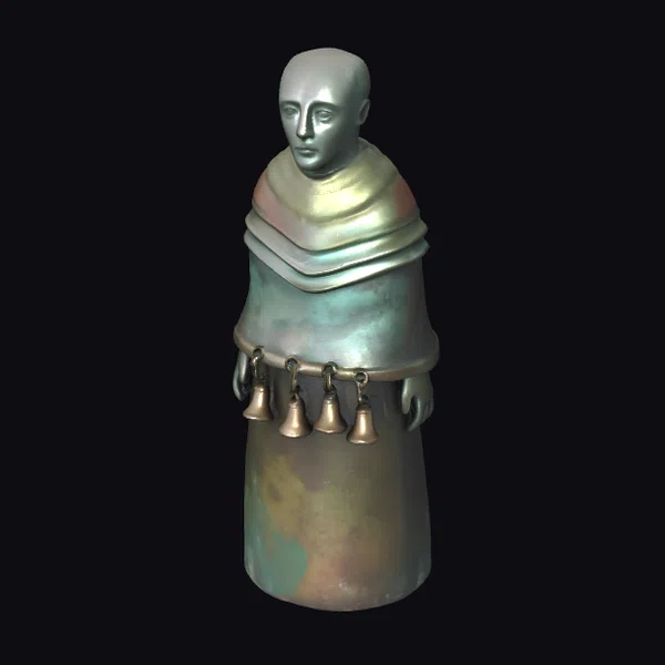 In a pose that commands tranquility, the monk statue features a bald head and a simple, serene facial expression, emphasizing a life of meditation and devotion. The shawl draped over the shoulders is meticulously detailed, showcasing folds and textures that suggest a soft, possibly woolen fabric. A notable feature is the belt adorned with small bells, adding a dynamic element to the otherwise static figure. The statue’s body is rendered in a cylindrical form, covered by a robe that transitions into the belt of bells, creating a harmonious blend of form and function. The metallic surface exhibits a beautiful green patina, with hints of pastel colors that add to its aesthetic appeal. This statue can find a home in various applications, including games, 3D printing for personalized decor, virtual reality environments, animations, or even architectural designs seeking unique decorative elements.
