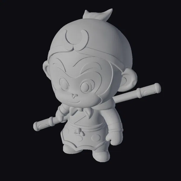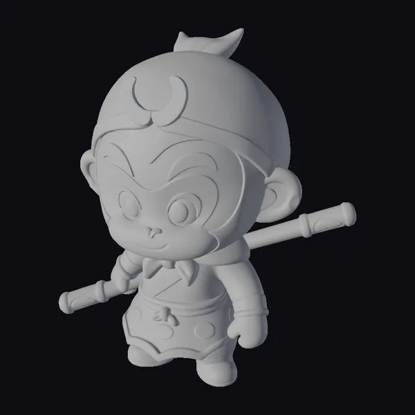 Gazing out with a cheeky smile, this cartoon monkey warrior toy stands at attention, staff at the ready. The model’s intricate details include a yellow helmet adorned with a green headband and crescent moon emblem, complemented by a red and white face mask with yellow and green accents. The orange skirt with black spots and blue scarf add a dynamic touch. This 3D model is perfect for games, animation, or print projects requiring a playful, adventurous vibe. Its colorful design and sturdy build make it an excellent choice for kids’ toys or educational materials.