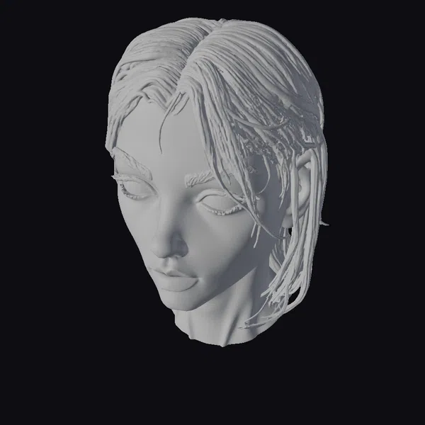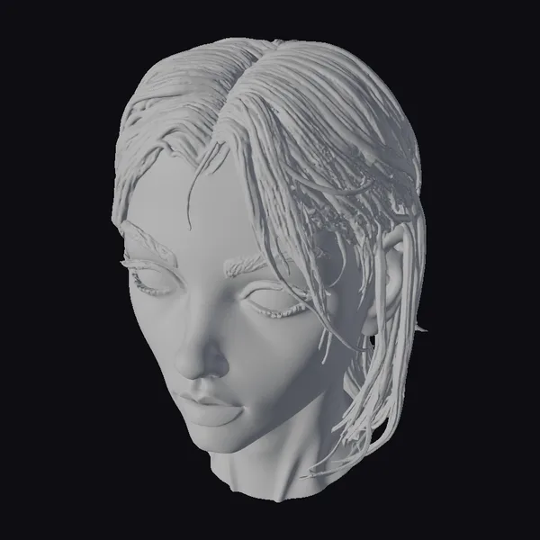 Positioned in a contemplative pose, this monochrome female bust showcases a highly detailed face with a neutral expression, inviting viewers to ponder its story. The model’s hair is rendered with strands that gently fall across her face and shoulders, adding a dynamic element to the otherwise static piece. The texture and shading are meticulously crafted to give the impression of a highly realistic sculpture, suitable for various applications including games, 3D printing, VR/AR experiences, and animation. The bust’s serene demeanor and detailed features make it a versatile asset for designers and artists seeking to add a touch of realism and elegance to their projects.