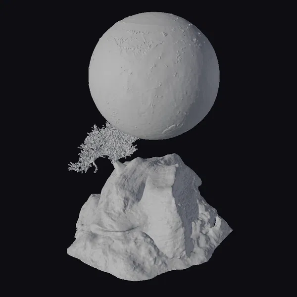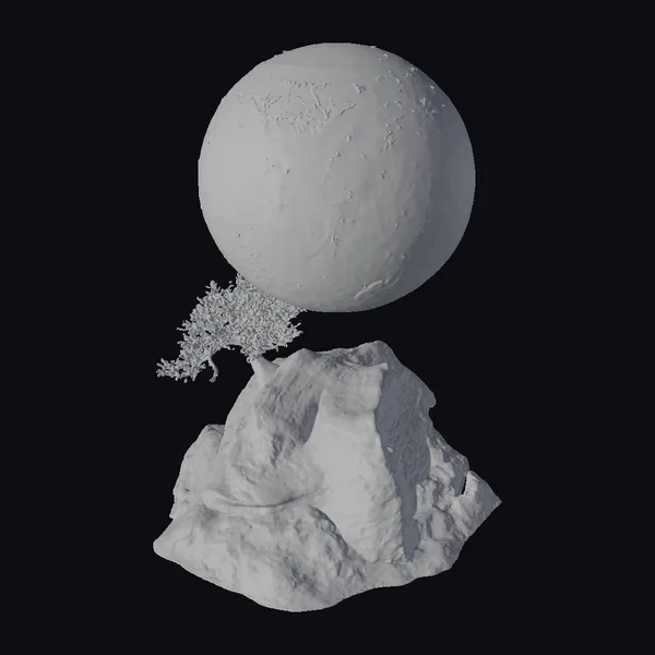 Perched atop a rugged, gray rock formation, a small, resilient tree stretches towards the sky, its delicate branches a stark contrast to the harsh, stone landscape. The rock itself is a marvel of detail, with deep crevices and a rough texture that suggests a world shaped by ancient, lunar cycles. Above, the moon looms large, its cratered surface a testament to the unforgiving vastness of space. This scene is perfect for projects requiring a serene, otherworldly setting, such as animations, games, or architectural visualizations. The model’s high level of detail, from the rock’s texture to the tree’s foliage, ensures a realistic and captivating visual experience.