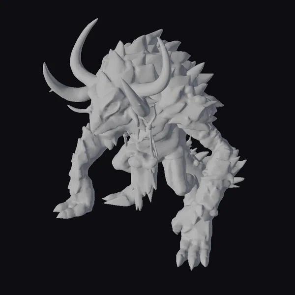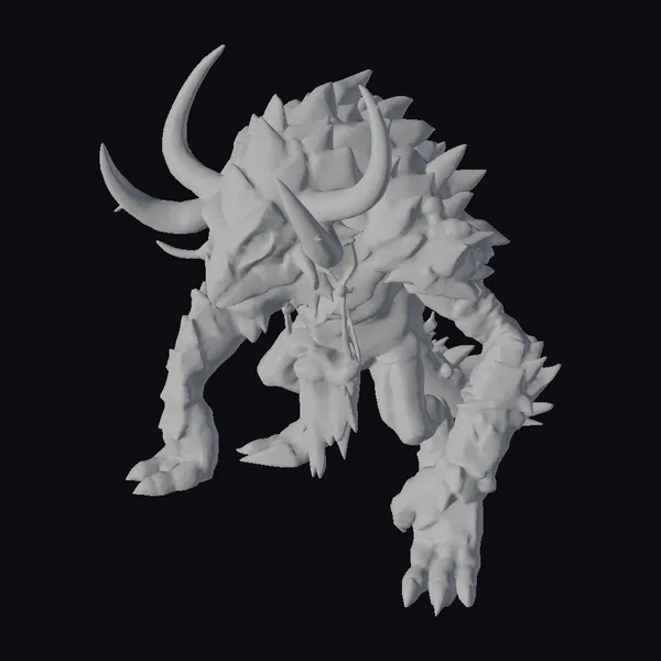 This imposing creature stands with a powerful stance, its body covered in a thick, green moss-like substance that contrasts sharply with the jagged, crystalline structures protruding from its back and forehead. Two curved horns add to its intimidating silhouette, while its red eyes seem to burn with an inner fire. The creature’s sharp claws and spiked limbs suggest a formidable predator. Ideal for use in fantasy games, animations, or designs requiring a mythical creature, this model is sure to capture attention. Its detailed texture and lighting make it suitable for high-quality 3D rendering and printing applications.
