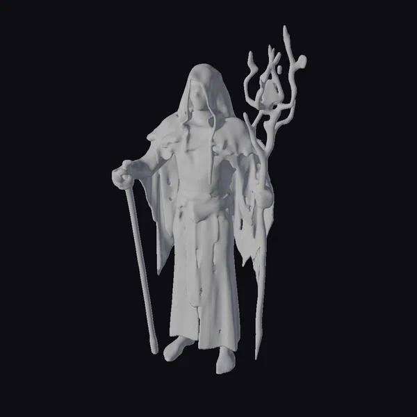 In a pose that exudes wisdom and power, the hooded druid stands with feet shoulder-width apart, its mossy green robe and earthy brown cape billowing gently around it. The druid’s hood casts a shadow over its face, adding to the air of mystery. A twisted, gnarled staff, adorned with moss and lichen, serves as a focal point for the druid’s magic, while a sturdy walking stick provides a grounding presence. The textures of the robe and cape are rich and detailed, with visible threads and folds that suggest a deep connection to the natural world. This 3D model would be perfect for use in games, animation, or VR/AR experiences where a mystical, ancient character is needed. Designers and artists can also use this model as a starting point for their own creations, perhaps reimagining the druid in different environments or scenarios.