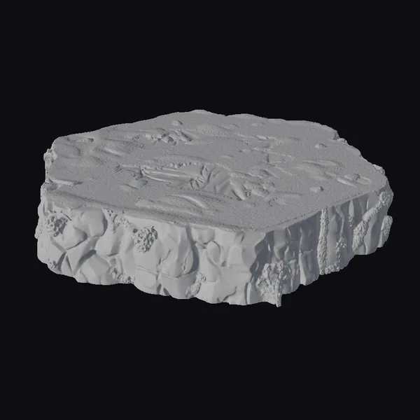 Perched on a stark white background, this stunning terrain slice showcases a mesmerizing blend of natural elements. The top surface is a vibrant green, with patches of gray stone peeking through the moss, while the edges are rugged and rocky, with hints of brown and gray. The model’s texture and lighting create a sense of depth and dimensionality, making it perfect for use in games, animations, or architectural visualizations. The terrain’s organic shape and natural beauty make it an excellent addition to any outdoor environment or landscape design.