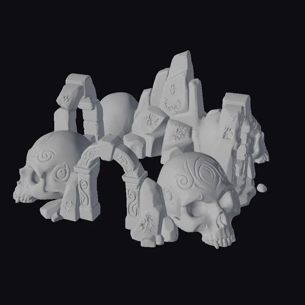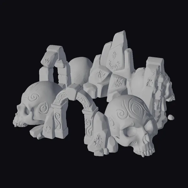 Perched in a dramatic pose, the mossy skull ruins boast an intricate design that invites the eye to wander. The two skulls, covered in a thick layer of green moss, are framed by crumbling stone arches and pillars, each bearing unique, swirling patterns that add to their mystique. The structure’s weathered appearance suggests centuries of exposure to the elements, with the moss and stone blending in a dance of nature and decay. The skulls themselves are masterfully detailed, with eye sockets and facial features that seem to tell a story of their own. This 3D model is perfect for projects that require a touch of fantasy and ancient mystery, such as game environments, animations, or architectural designs. Its unique blend of horror and elegance makes it a versatile asset for creators looking to add depth and intrigue to their work.