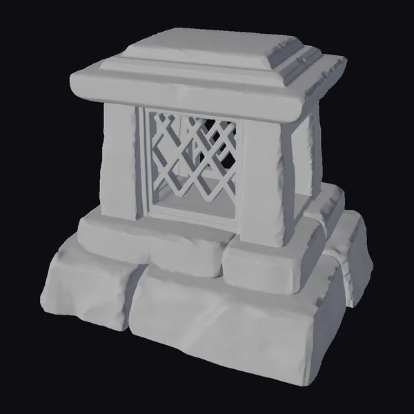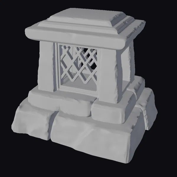 Crafted with meticulous attention to detail, this stone shrine boasts a sturdy base that gradually tapers into a smaller, square structure adorned with a decorative lattice window. The gray stone surface is generously splashed with green moss, suggesting years of exposure to the elements. The lattice window, composed of interlocking diamond shapes, filters the light and adds an air of mystery. As a 3D model, this shrine can be seamlessly integrated into various projects, such as game environments, architectural visualizations, or animated films, to evoke a sense of history and mystique. Its weathered appearance and intricate details make it an excellent choice for designers seeking to create immersive, fantastical worlds.