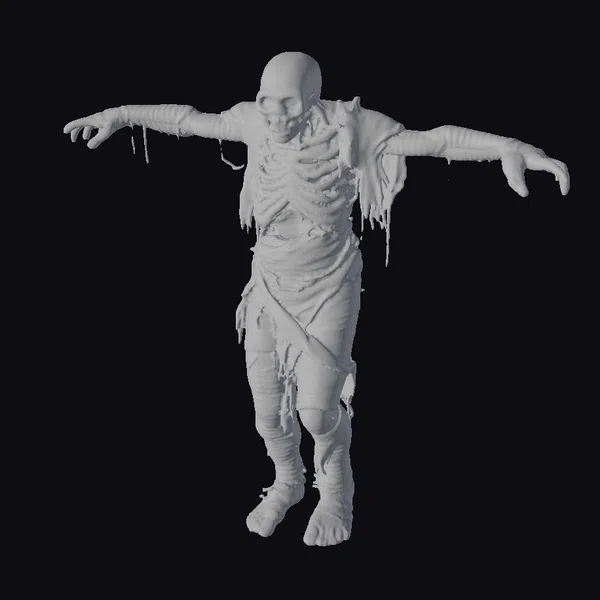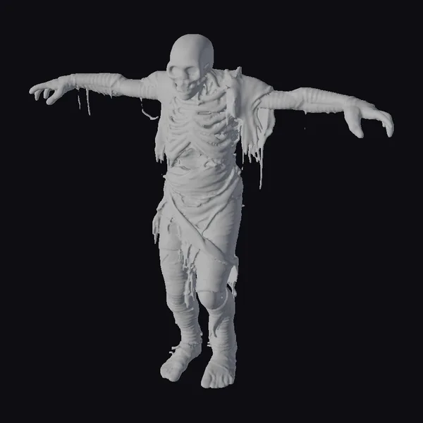 This highly detailed, realistic 3D model of a mummified corpse showcases a terrifying undead creature. The mummy’s skeletal frame is partially exposed, with tattered bandages wrapped around its body, hanging loosely to reveal bones in some areas. Its face is a skull with a horrific expression, adding to the eerie atmosphere. The A-pose stance, with arms stretched out to the sides, enhances the sense of foreboding. This model is perfect for use in horror-themed games, animations, VR/AR experiences, or as a decorative piece in a dark fantasy setting. Its high level of detail makes it suitable for close-up shots and animations.