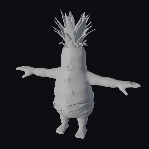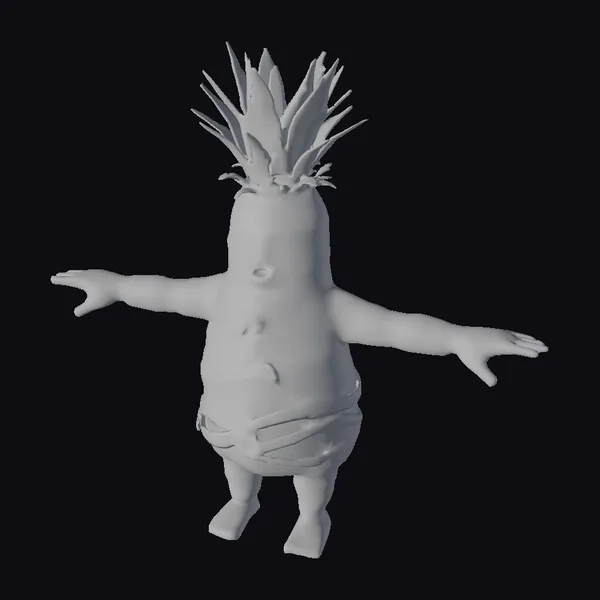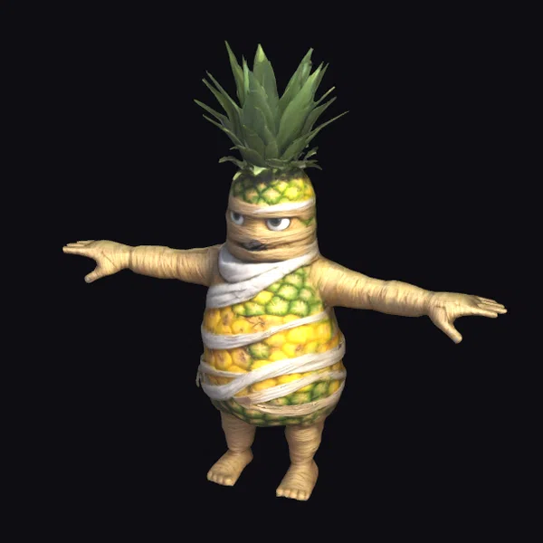 Gaze upon a radiant, cartoonish creature that’s equal parts mummy and pineapple, standing proudly in a T-pose. The pineapple’s yellow and green skin is wrapped in crisscrossing bandages, giving it a delightfully wrapped appearance. A tuft of spiky green leaves crowns its head, adding a pop of color and whimsy. The character’s facial features are defined by a small nose, thin eyebrows, and a subtle smirk, exuding a playful demeanor. Its arms are outstretched in a classic T-pose, beckoning creative possibilities in games, animations, or 3D designs. The model’s intricate details, from the texture of the pineapple skin to the wrapped bandages, make it a standout asset for projects seeking a touch of humor and fantasy.