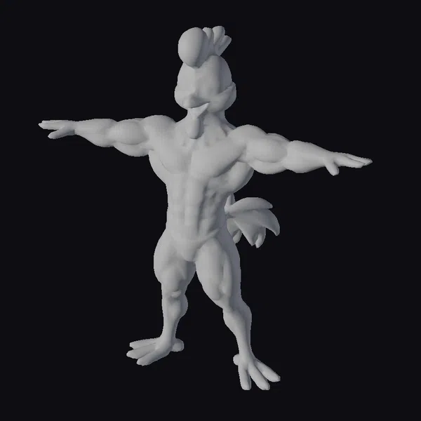 Standing proudly with its arms outstretched, this anthropomorphic chicken showcases its impressive physique. The model’s muscular definition is accentuated by a subtle gradient of pink and white hues, giving it a lively appearance. The red comb on top of its head adds a splash of color, matching the briefs that leave little to the imagination. Its large, expressive eyes and yellow beak bring a sense of personality to the character. This model is perfect for projects requiring a humorous, larger-than-life character, such as animations, games, or comic book illustrations. Its stylized features make it a great fit for designs that require a touch of whimsy and fun.