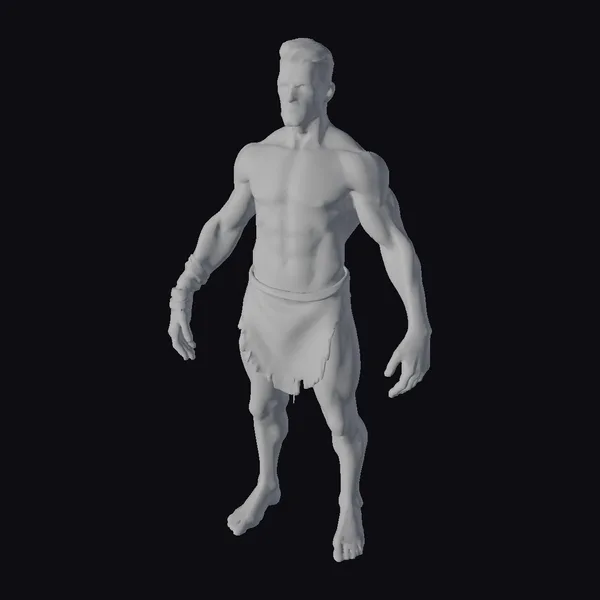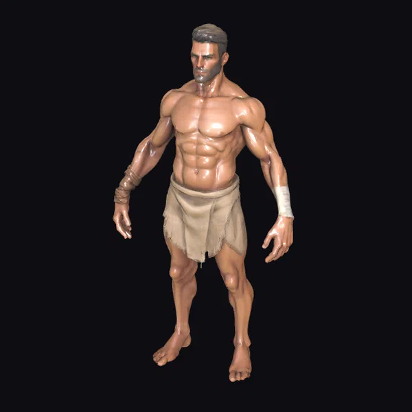 This 3D model captures the essence of an ancient warrior with meticulous detail. The muscular male figure stands with a confident posture, showcasing a highly defined physique that speaks to his combat prowess. His skin has a warm, sun-kissed glow, and a rugged beard frames his determined expression. A simple, beige cloth is wrapped around his waist, frayed and torn in places, suggesting a life of battle and hardship. Bandages on his wrists add a touch of realism, indicating recent conflicts. The model’s realistic style makes it suitable for various applications, including games, animation, and design projects that require a character with a strong, historical presence. The detailed textures, realistic lighting, and accurate proportions ensure that the model can be used to create compelling scenes and stories.