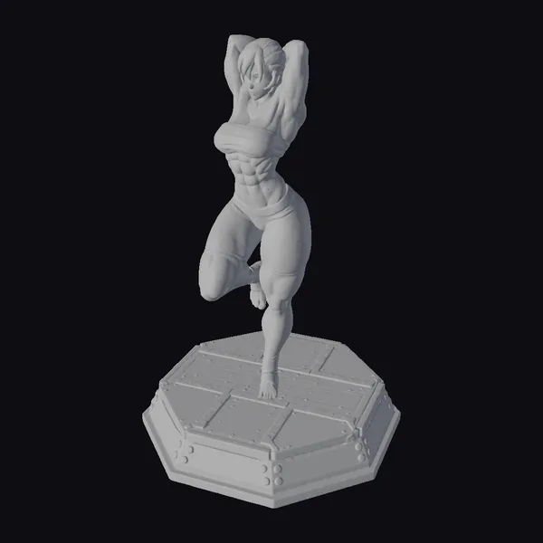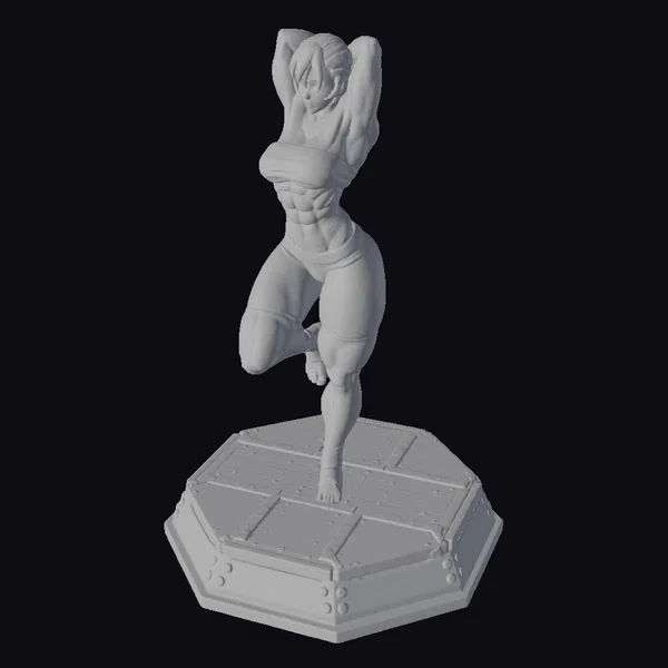 Detailed to perfection, this 3D model showcases a muscular anime male character in a captivating pose. His arms are raised above his head, emphasizing his physical prowess. The character’s facial features are defined, with a determined expression that adds to his strong demeanor. The green shorts and ankle wrap provide a pop of color against his pale skin, while the grey cloth around his waist adds a touch of realism. The black base, adorned with metal details, grounds the figure and enhances his dynamic stance. Ideal for use in animations, games, or as a decorative piece, this model is sure to impress with its detailed anatomy and vibrant colors.