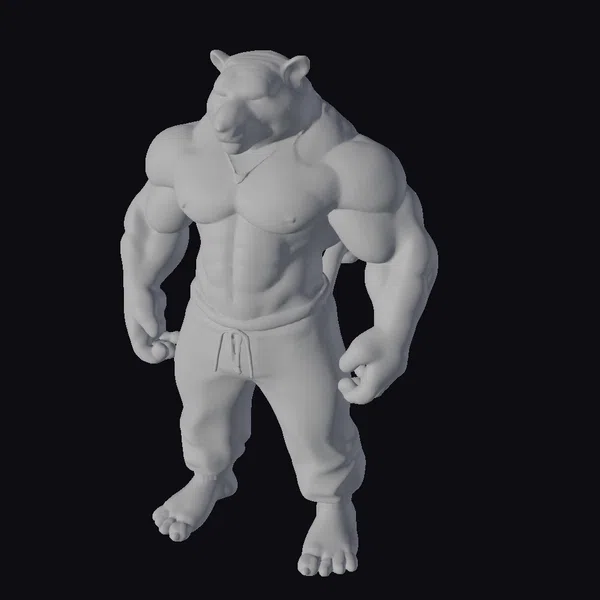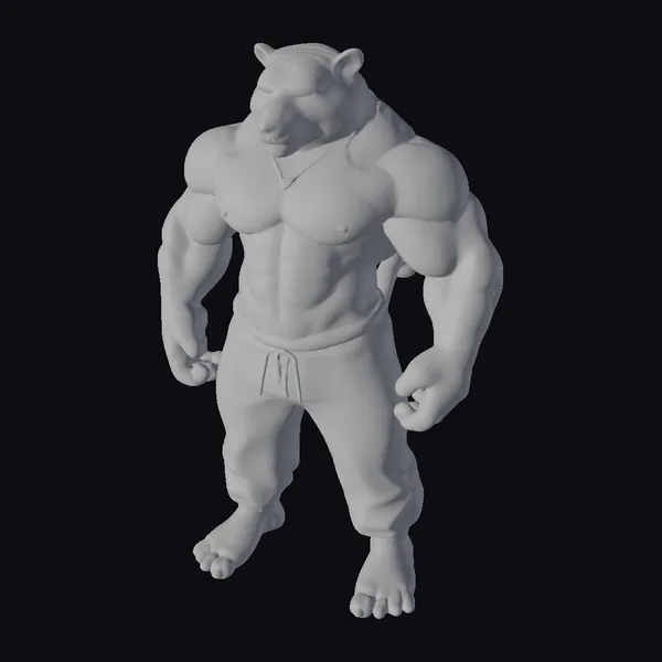 Standing tall with a commanding presence, this stylized anthro tiger boasts a chiseled physique complete with defined abs, large pectoral muscles, and a distinctive tiger’s head. The character’s bare feet and exposed torso accentuate its raw power, while the tracksuit pants add a touch of modern flair. The intricate details, from the nipple and navel to the textured fur and defined muscles, make this model a standout. Ideal for use in animation, games, or as a unique design element, this model is sure to capture attention.