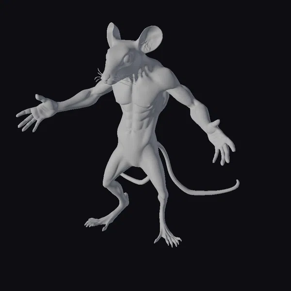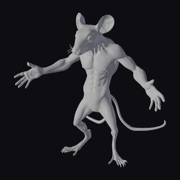 This stylized, anthropomorphic rat stands out with its striking pose, showcasing a blend of human-like muscularity and rodent characteristics. The model’s detailed anatomy includes well-defined muscles, particularly in the chest and arms, set against a predominantly gray body with pink accents on its ears, tail, and paws. The rat’s facial features are cartoonish yet expressive, with large ears and a pointed snout. The pose, with arms extended horizontally and legs shoulder-width apart, conveys a sense of readiness or challenge. This model would be perfect for projects requiring a unique, fantastical character, such as animations, games, or conceptual designs. Its detailed and stylized appearance allows for versatile use, from comic books to virtual reality experiences.