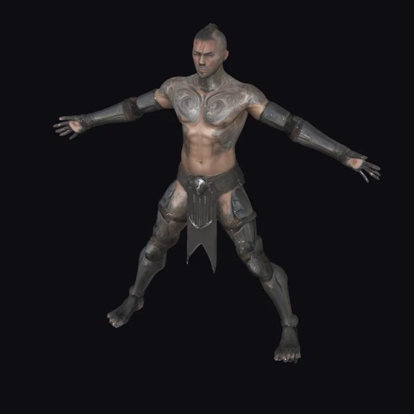 Detailed with precision, this 3D model of a muscular armored warrior showcases a robust physique and a fierce demeanor. The warrior’s body is adorned with glowing tribal tattoos that add an ethereal quality to his appearance. His dark armor, consisting of arm guards, a waist cover, and leg guards, provides a stark contrast to his glowing tattoos and skin. The model is captured in a dynamic pose with arms outstretched, suggesting movement or a powerful stance. The level of detail in the textures, lighting, and overall anatomy makes this model suitable for high-quality projects such as game development, animation, and virtual reality experiences.