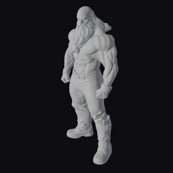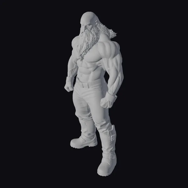 Detailed with precision, this 3D model showcases a muscular bald man with a striking white beard cascading down his chest. He stands in a powerful stance, fists clenched, wearing sleek black pants and boots that reflect light, suggesting a shiny material. His wrists are adorned with thick black cuffs, adding an edgy touch to his overall look. The model’s realistic style, complete with defined muscles and a bald head, makes him an ideal character for various projects, including games, animations, and virtual reality experiences. The high level of detail, especially in the facial features and physique, ensures a lifelike representation.