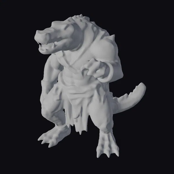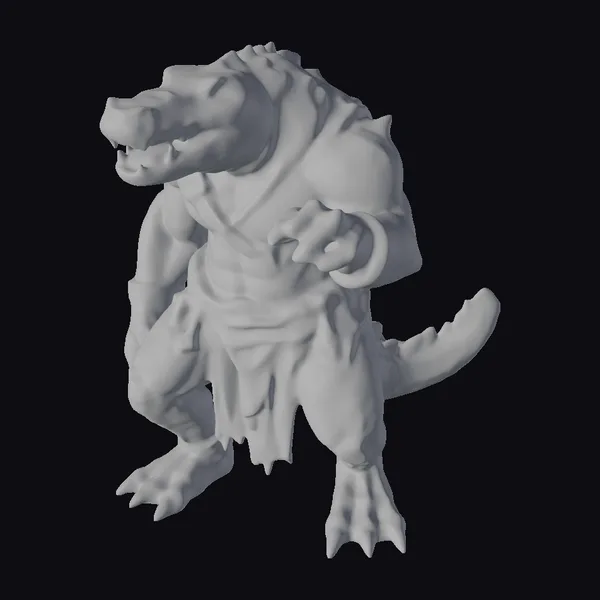 Standing in a powerful stance, this humanoid crocodile boasts a highly detailed physique, from the texture of its scaly skin to the muscles rippling beneath. The pose captures a moment of tension or readiness, with one hand clenched and the other relaxed. The tattered cloth and leather bands suggest a backstory of battles or a warrior’s life. The model’s intricate details make it perfect for use in games, 3D printing, VR/AR experiences, animation, and design projects where a fantasy creature is needed. Its unique blend of human and reptilian features offers a wide range of creative possibilities.