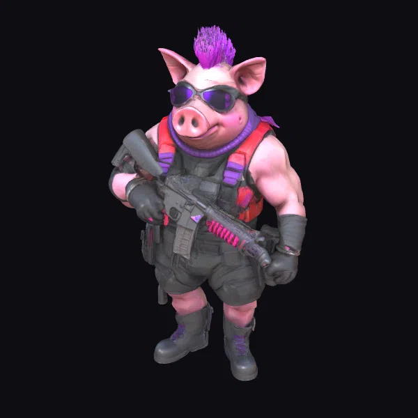 Standing tall with a robust physique, this cyberpunk pig warrior showcases intricate details such as a pink snout, sharp teeth, and a purple mohawk. The character’s attire consists of a sleek black and red tactical vest, complemented by black shorts, boots, and gloves. A futuristic rifle with pink accents is held firmly in its hands. The model’s stylized features, including oversized sunglasses and a menacing grin, contribute to its unique charm. Ideal for projects requiring a blend of sci-fi and fantasy elements, this 3D model can elevate games, animations, or virtual reality experiences with its dynamic presence.