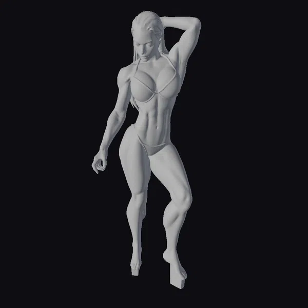 Detailed with precision, this 3D model of a muscular female bodybuilder captures a dynamic pose, highlighting her toned muscles and athletic build. Her long brown hair cascades down her back as she stands in a white bikini, one hand raised behind her head. The model’s facial features are defined, with a determined expression that speaks to her fitness and strength. The detailed textures and realistic rendering make this model suitable for various applications, including games, animation, 3D printing, and virtual reality experiences.