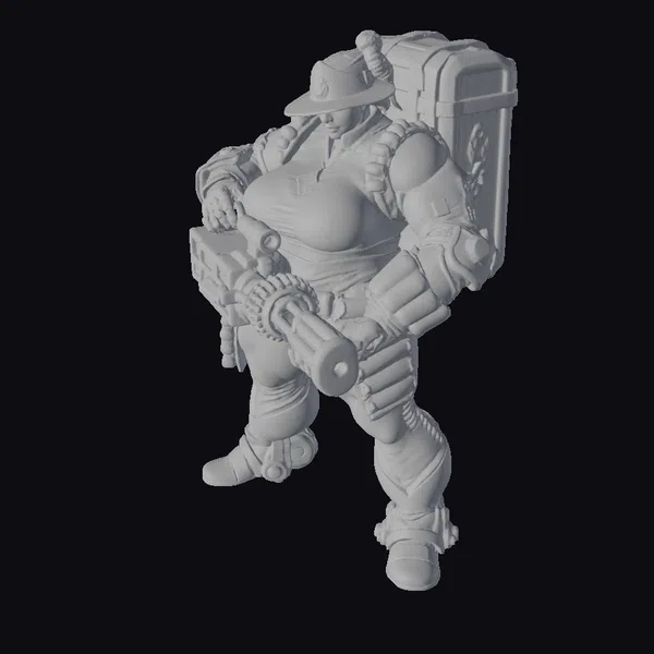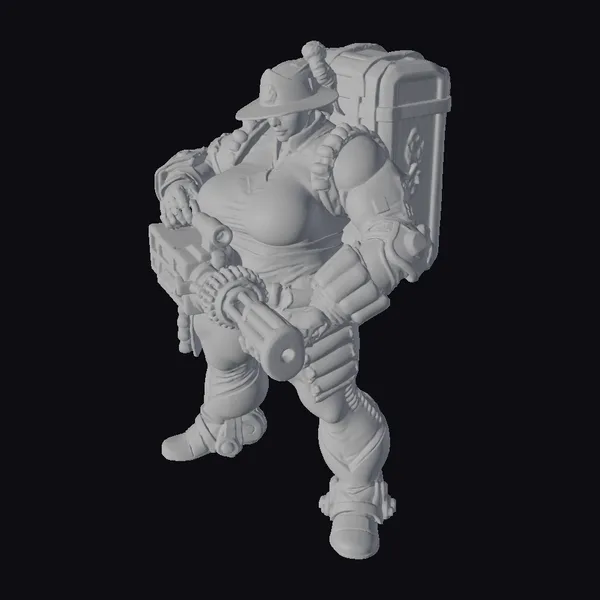 Detailed with precision, this stylized character model showcases a powerful female gunner, posed dynamically with her weapon at the ready. Her green and gray armor, complemented by metallic accents, exudes a sense of industrial and military prowess. The model’s intricate details, from the mechanical backpack to the textures of her clothing and gear, make it an excellent choice for projects requiring a strong, sci-fi presence. Ideal for use in game development, animation, virtual reality, and design projects where a robust character model is needed.