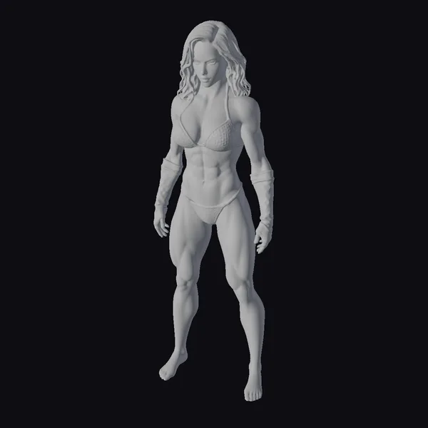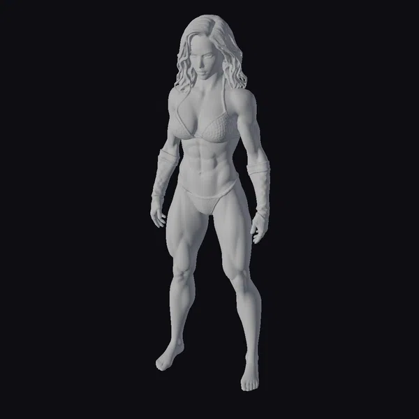 Detailed with precision, this stylized 3D model of a muscular female warrior showcases a toned physique, accentuated by a gray bikini and complemented by black gloves that cover her forearms. Her dark, shoulder-length hair frames her determined expression. The model’s pose, with feet shoulder-width apart, conveys a sense of stability and strength. The intricate details, from the defined muscles to the texture of the bikini and gloves, make this model suitable for various applications, including games, animation, and design projects that require a strong, female character. The high level of detail, especially in the face and hands, ensures a realistic and engaging character that can be used in a variety of creative contexts.