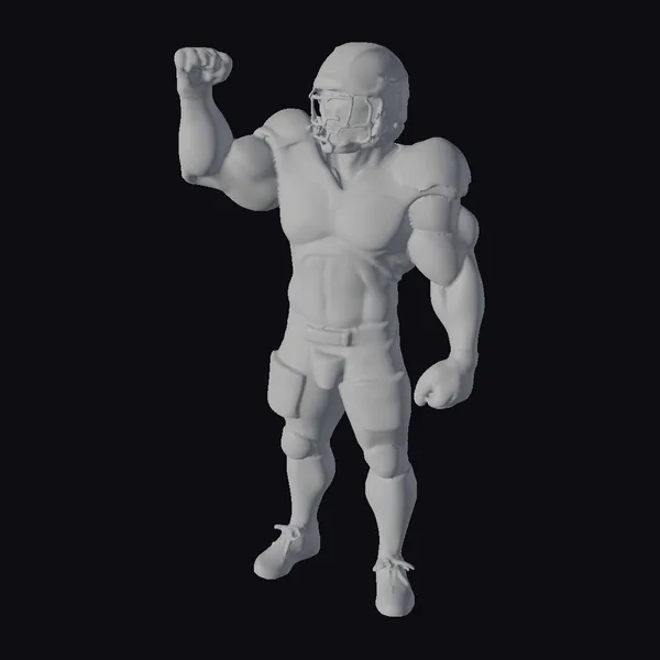 Detailed with precision, this 3D model of a football player captures the essence of athleticism and strength. The player stands in a powerful stance, one arm flexed in a triumphant gesture. His white uniform is meticulously textured, from the padding on his shoulders and the detailed facemask on his helmet, to the cleats on his feet. The realistic rendering of his muscular arms and legs conveys a sense of dynamism and energy. This model is perfect for projects requiring a lifelike representation of a football player, suitable for use in animations, games, virtual reality experiences, and detailed design work.
