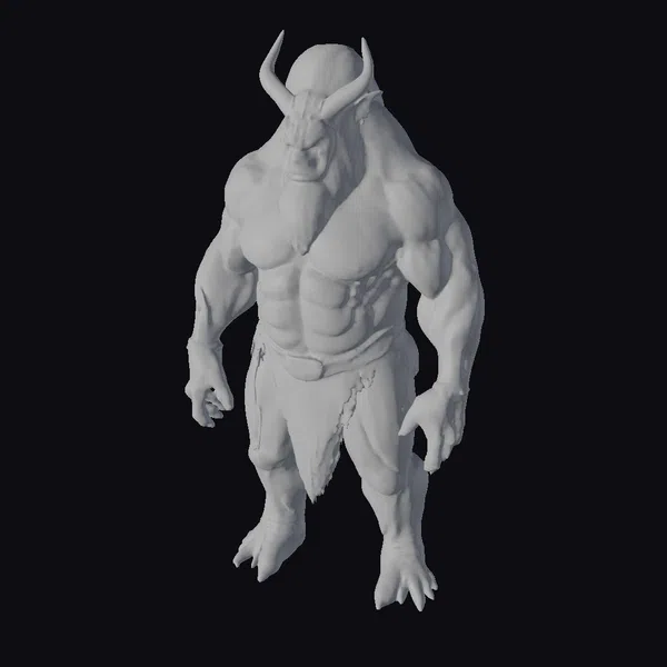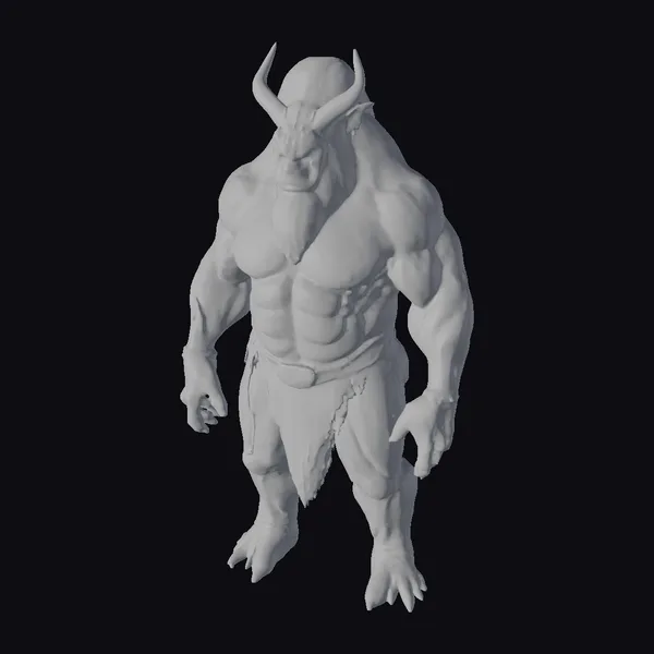 Standing tall with an imposing stance, this muscular horned humanoid beast exudes an aura of raw power and ferocity. Its body is a masterpiece of detailed anatomy, with each muscle fiber and tendon meticulously rendered to showcase its incredible strength. The creature’s skin is a warm, earthy tone, with darker fur covering its head, arms, and legs, while its torso remains bare to highlight its chiseled physique. A pair of curved horns protrudes from its forehead, adding to its intimidating visage. The tattered remains of a loincloth and arm wrappings hint at a battle-hardened existence. This model is perfect for use in games, animation, and design projects where a fearsome creature is needed.