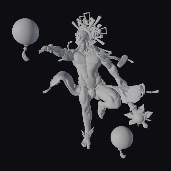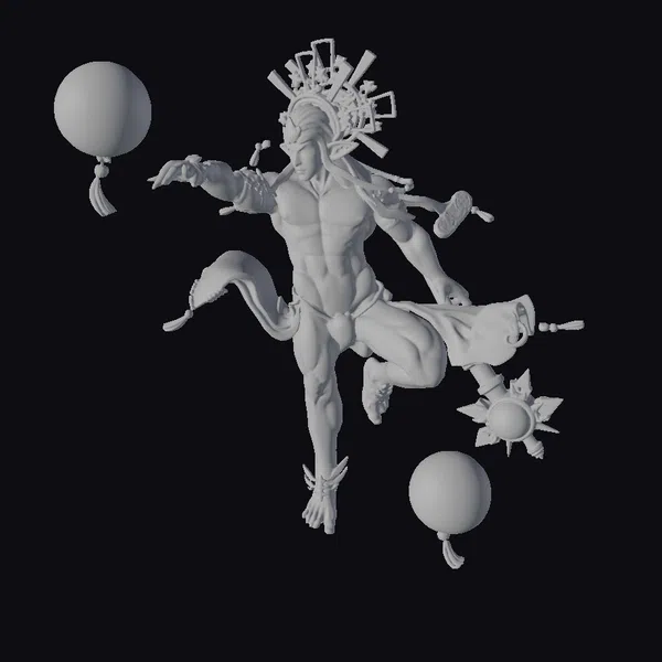 Gazing upon this mesmerizing figure, the intricate details of his physique and attire leap into focus. His muscular torso glistens with a subtle sheen, while his blue and gold headdress appears to be crafted from a dazzling array of metallic components. Three iridescent orbs, each adorned with a flowing red tassel, seem to hover around him, imbuing the scene with an air of mystique. The model’s pose, with one leg raised and arms outstretched, conveys a sense of fluid motion, as if caught in the midst of a celestial dance. This 3D model would be perfect for use in games, animation, or 3D printing projects requiring a fantastical, high-fantasy character.