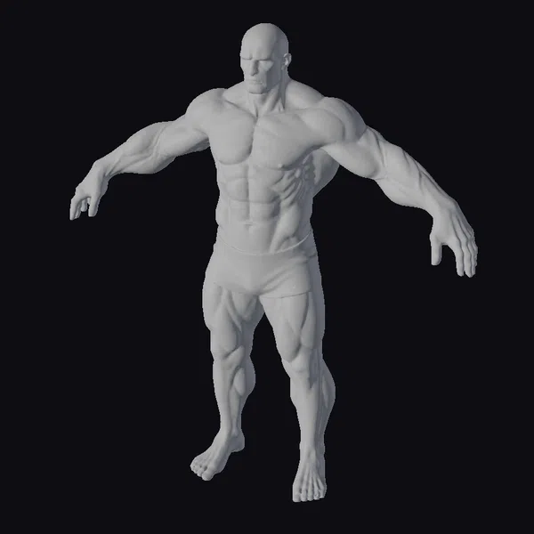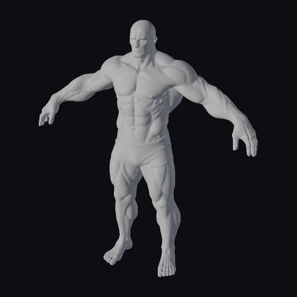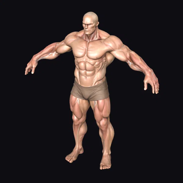 Detailed down to the finest detail, this 3D model of a muscular male physique showcases an impressive build with well-defined muscles, a bald head, and minimal clothing. The pose, with arms outstretched and legs shoulder-width apart, accentuates the model’s physique, making it ideal for projects requiring a strong, athletic figure. The realistic style and texture bring a lifelike quality, suitable for applications in fitness, sports, or any scenario demanding a powerful human presence, such as games, animation, and design.