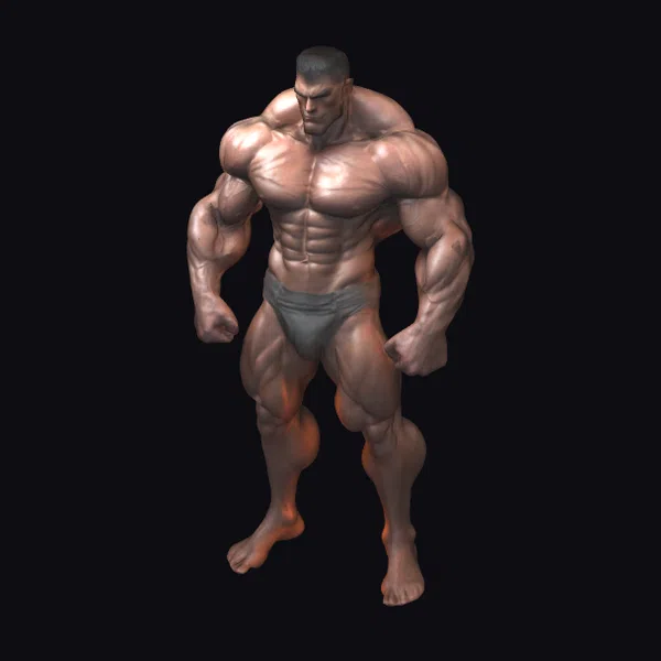 Standing tall with an imposing stance, this hyper-muscular male model showcases a physique that is both awe-inspiring and meticulously detailed. Every muscle group is accentuated, from the pectorals down to the quadriceps, highlighting a body sculpted to its utmost potential. The short, dark hair and focused expression add to the intensity of the character, making it a compelling addition to any project requiring a symbol of strength or an exaggerated human form. Ideal for use in fitness promotions, cinematic productions, video games, or architectural visualizations where a strong human presence is desired.
