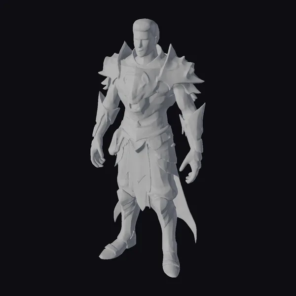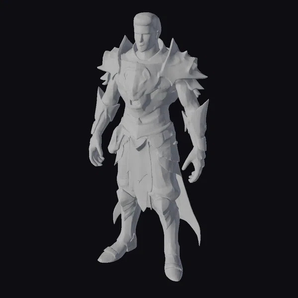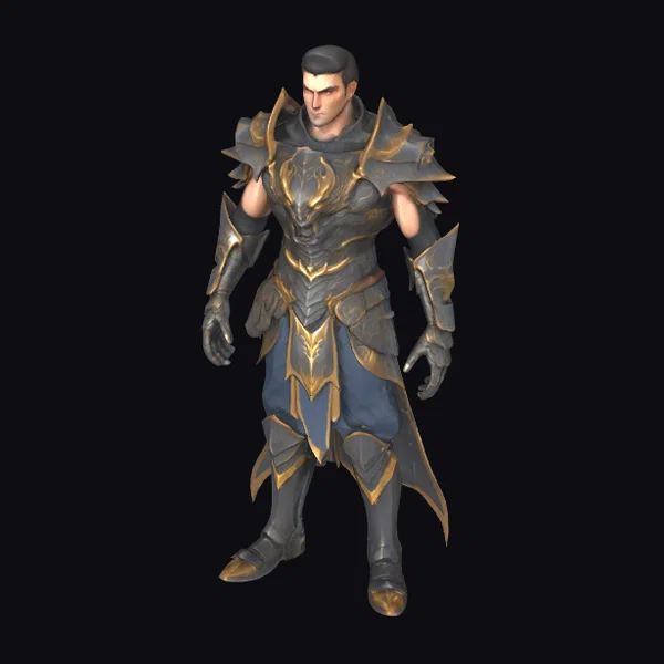 Detailed with precision, this stylized character model showcases a muscular male warrior in a dynamic pose, donning a meticulously crafted suit of armor. The armor itself is a blend of dark metal and gold, featuring intricate designs and spiked elements that add to its fantasy appeal. The character’s blue pants peek through the armor’s gaps, adding a touch of color. The model’s heroic stance and detailed textures make it perfect for use in games, animation projects, or as a design reference. Its stylized nature allows for versatile application across various creative projects.