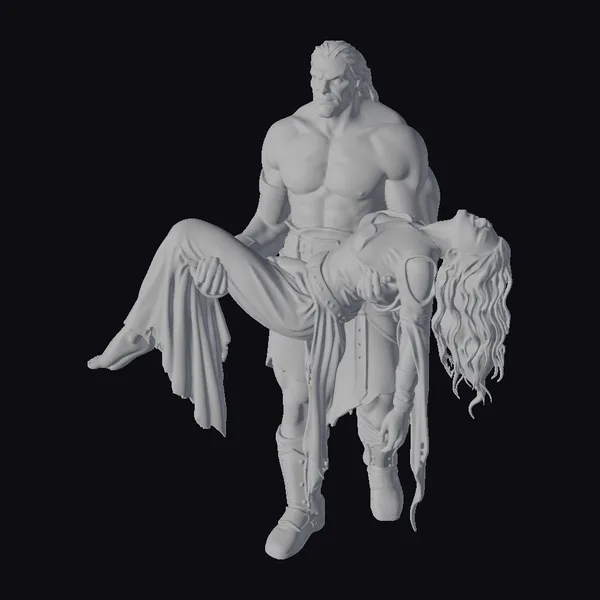 This powerful 3D model depicts a muscular man cradling a woman in his arms, her head tilted back in a dramatic pose. The man’s physique is defined by prominent muscles, and his facial expression is set in determination. The woman’s long red hair flows down her back, and her green dress is torn and tattered, suggesting a narrative of struggle and rescue. The model’s realistic style and attention to detail make it suitable for use in games, animation, and design projects that require a compelling, heroic scene. The man’s rugged attire, including his boots and shorts, adds to the post-apocalyptic feel of the scene.