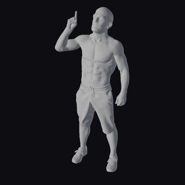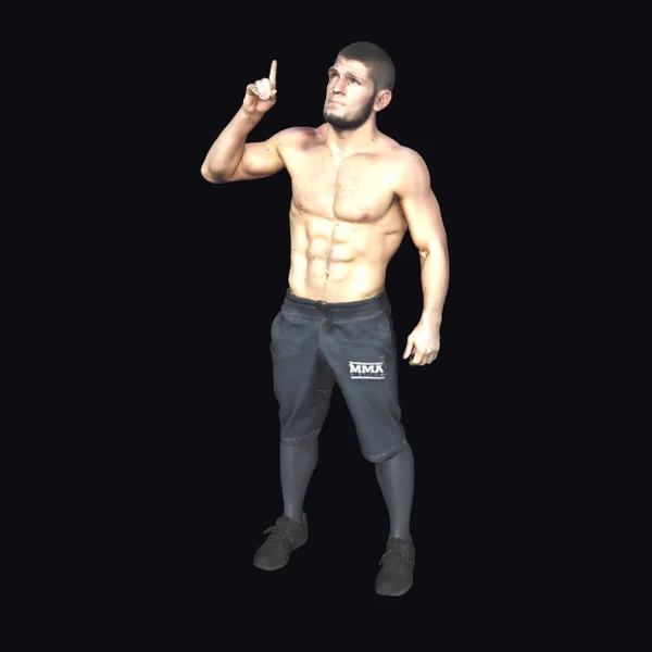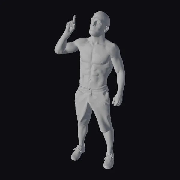 Detailed with precision, this 3D model captures a muscular man in a dynamic pose, pointing upwards with his right hand while standing with a slight stance. His short hair and beard add to his rugged charm, while the defined muscles across his torso highlight his athletic build. The MMX logo on his black shorts adds a touch of authenticity to his appearance. This model is perfect for projects requiring a strong, confident male character, such as animations, games, or architectural visualizations. Its realistic style ensures it will blend seamlessly into any high-quality production.
