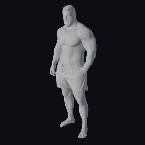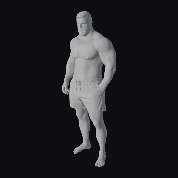 This 3D model depicts a muscular man with a strong, defined physique, standing in a relaxed pose with one hand casually placed in his pocket. His short, dark hair and beard add to his rugged charm. The model’s facial features are chiseled, with a slight smirk suggesting confidence. He wears black shorts with a reflective stripe, and his feet are clad in gray toeless sandals. The model’s proportions are realistic, making him suitable for various applications, including games, animation, and design projects. His athletic build and confident demeanor make him an excellent choice for projects requiring a strong, masculine character.